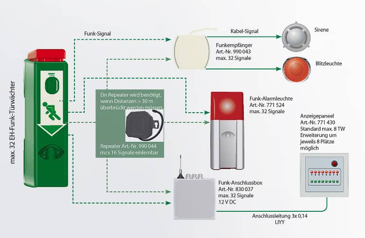 Sofern mehrere Türwächter zum Einsatz kommen, werden die Signale zunächst auf ein zentrales Empfangsgerät (Anschlussbox) aufgeschaltet, welches diese an das entsprechende Ausgabegerät (z.B. Anzeigepaneel, Sirene oder Blitzleuchte) weiterleitet. Hierfür kann der Benutzer entweder eine sternförmige Verdrahtung oder eine BUS-Verdrahtung vornehmen